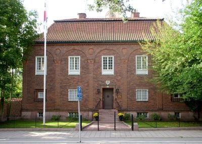 El edificio funciona como residencia del embajador de Corea del Sur, con su entrada principal orientada hacia la antigua calle Strandvägen.