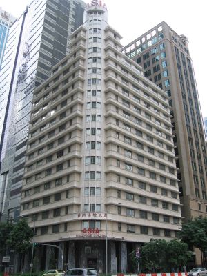 El Edificio de Seguros Asia se eleva 20 pisos con aletas de mármol travertino en su fachada y salientes continuos que proporcionan protección solar.