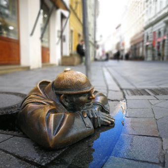 El escultor Viktor Hulík creó esta obra pública en 1997 durante la renovación urbana de Bratislava tras la independencia de Eslovaquia.
