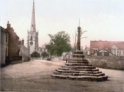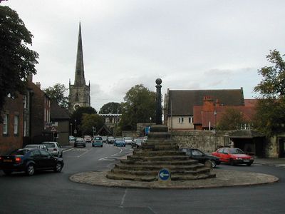Una cruz medieval se alza sobre escalones octagonales de piedra en una intersección de carretera del norte, marcando lo que fue el centro de una residencia real. Esta estructura permanece como un raro ejemplo superviviente de su tipo en esa época.