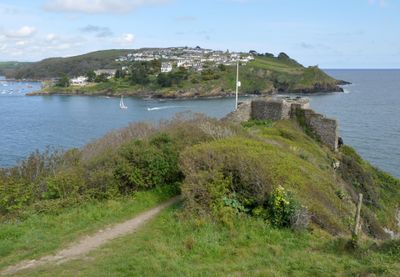 La fortificación de piedra presenta un diseño en forma de D con cinco troneras y se alza sobre un promontorio dominando la entrada al puerto de Fowey.
