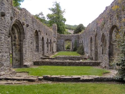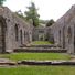 Las ruinas de piedra incluyen una puerta norte conservada, muralla norte con bastiones, aposentos del abad y cimientos del complejo original.