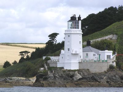 La torre octagonal blanca de granito con casa del guardián adjunta mide 19 metros de altura en la entrada del Puerto de Falmouth.