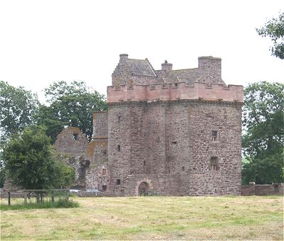 El Castillo de Melgund exhibe muros de piedra gruesos, una torre rectangular y múltiples elementos defensivos típicos de las fortificaciones escocesas.