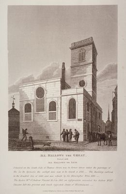 All-Hallows-the-Great presentaba elementos arquitectónicos barrocos con ventanas redondeadas y muros de piedra sobre Upper Thames Street en Londres.