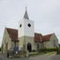 La iglesia de piedra presenta una torre revestida de madera, techo de tejas rojas y paredes gruesas con arcos sencillos de construcción medieval.