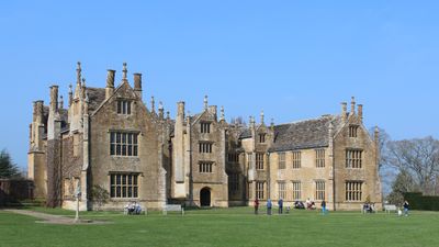 El edificio exhibe arquitectura de estilo Tudor con chimeneas decorativas, ventanas con parteluces y tallas en piedra en todas las fachadas.