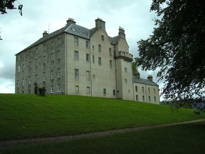 El Castillo Grant presenta un edificio principal de cinco pisos con alas laterales, situado a 2 millas al oeste del río Spey.