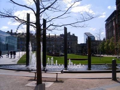 Cathedral Gardens es un espacio público en el centro de Manchester con caminos de piedra natural y áreas pavimentadas rodeadas de árboles maduros y amplios céspedes. La distribución combina pavimentación con áreas verdes que crean un ambiente equilibrado.