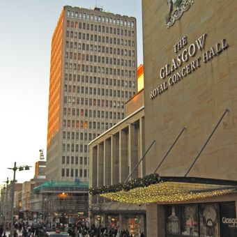 El Glasgow Royal Concert Hall presenta un exterior de piedra curvado y alberga un auditorio principal para 2475 personas y la Sala Strathclyde para 400 asistentes.