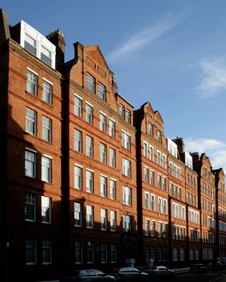 El bloque residencial exhibe arquitectura victoriana tardía con múltiples unidades residenciales distribuidas en varios pisos cerca del Palacio de Kensington.
