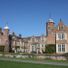 La residencia señorial presenta muros de ladrillo rojo, chimeneas altas, ventanas con parteluces y un foso rectangular lleno de carpas alrededor del edificio.