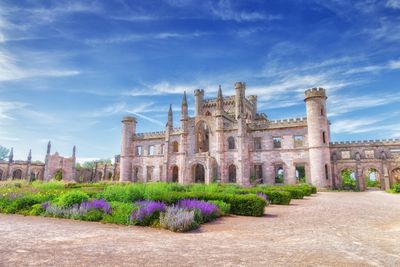 El castillo muestra elementos arquitectónicos góticos y clásicos con muros almenados que se extienden por las diferentes alas de la estructura.