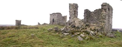 El castillo presenta una torre central de dos pisos situada en una colina, con vistas al campo de Northumberland desde su posición elevada.