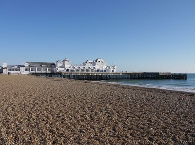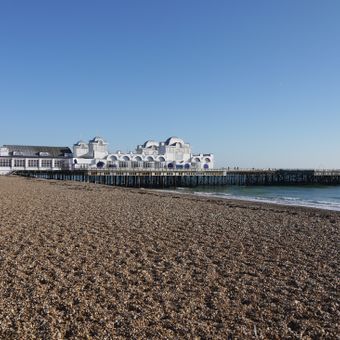 El South Parade Pier se extiende 180 metros sobre el Solent, con una amplia cubierta de paseo, pantallas contra el viento e instalaciones de entretenimiento.