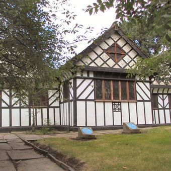 La Iglesia de San Lorenzo presenta una estructura de madera con paredes exteriores en blanco y negro, exhibiendo elementos arquitectónicos tradicionales del período Tudor.