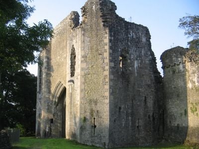 Los restos incluyen cimientos visibles de una torre semi-octagonal y una entrada cubierta de hiedra con ranuras de rastrillo y herrajes de puerta.