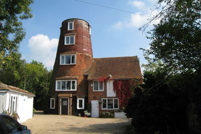 El molino de ladrillo de cinco pisos en Mark Cross presenta paredes revestidas de tejas y funcionaba con cuatro aspas Patent y una cubierta estilo Kentish.