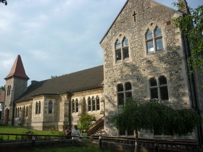 El edificio escolar presenta arquitectura neogótica con muros de piedra Kentish, detalles en piedra Bath y una torre de dos pisos.