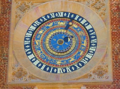 El reloj muestra una visión pre-copernicana del universo, con información sobre signos zodiacales y fases lunares según el entendimiento medieval.