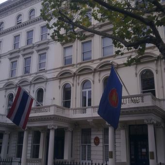 La Embajada de Tailandia se encuentra en un edificio georgiano en Queen's Gate, con elementos arquitectónicos tradicionales y salas de recepción.