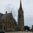 La iglesia de piedra presenta arquitectura neogótica con arcos puntiagudos, bóvedas nervadas y ventanas detalladas con vidrieras por toda su estructura.
