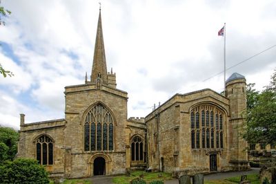 St. John the Baptist es una iglesia medieval en Burford con una torre central, diseño cruciforme y una nave de cinco tramos flanqueada por capillas a ambos lados. La estructura muestra características típicas de su época con muchos detalles arquitectónicos que se conservan hoy.