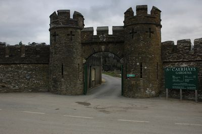 Garden wall with gateways and folly tower attached to west and east of Caerhays castle