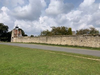 Outer Gatehouse Ruins And Length Of Precinct Wall Running East To Abbey Gate Cottages, gatehouse in Beaulieu, Hampshire, England, UK