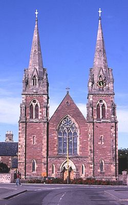 La iglesia presenta torres cuadradas gemelas con una fachada gótica occidental, incorporando una entrada en arco puntiagudo bajo una vidriera de cuatro luces.
