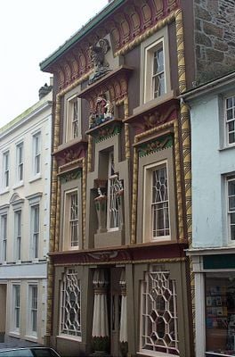 La Egyptian House es un edificio catalogado Grade I en Chapel Street, Penzance, con una fachada simétrica de tres plantas adornada con elementos del estilo egipcio. Las decoraciones incluyen capiteles en forma de loto y diseños jeroglíficos realizados en piedra artificial en toda la fachada frontal.