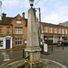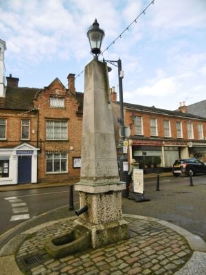 Pump and signpost in Market Place, architectural structure in Ampthill, Central Bedfordshire, England, UK