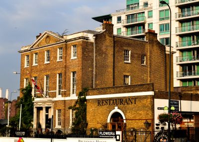 Brunswick House en Wandsworth Road es una casa de ciudad georgiana con paredes de ladrillo ambar y cinco ventanas distribuidas en tres pisos. El edificio tiene un portico semicircular de estuco con columnas acanaladas y cornisas decorativas.