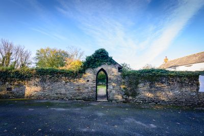 Garden wall and porches attached to front of Colan Barton Farmhouse, wall in Colan, Cornwall, England, UK
