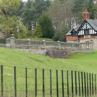 Causeway carrying Eccleston Approach Drive, south of Eccleston Lodge, Grade II listed causeway in the parish of Eaton, Cheshire West and Chester, Cheshire, UK
