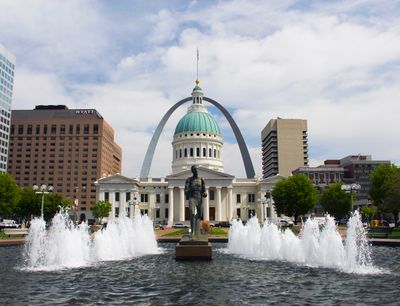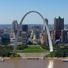La ciudad se extiende junto al río Misisipi, con el Arco Gateway de 192 metros de altura y numerosos edificios históricos en el distrito central.