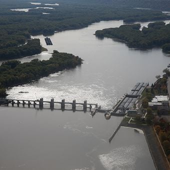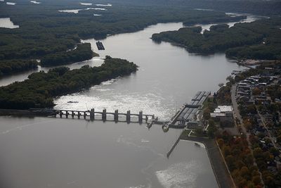 Lock and Dam No. 10, Esclusa de navegación y presa de tierra en el río Mississippi Superior, Iowa.