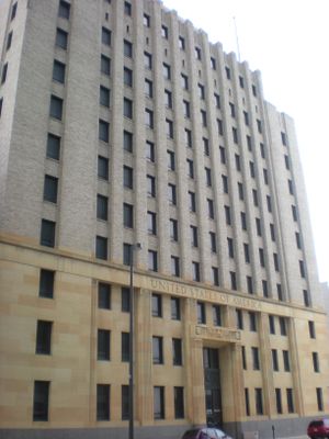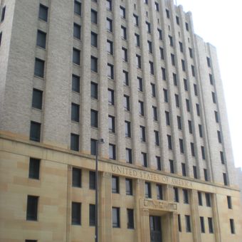 El Federal Office Building se eleva trece pisos con arquitectura clásica simplificada y elementos Art Deco en South 15th Street del centro de Omaha.