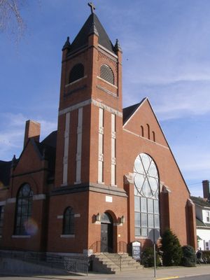 La Primera Iglesia Presbiteriana se encuentra en las calles High y Franklin, con una torre campanario cuadrada y arcos redondos.