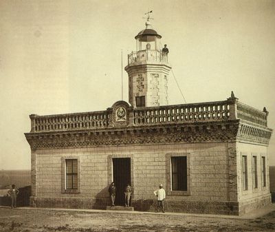 La entrada del faro muestra el escudo oficial del Cuerpo de Ingenieros de Caminos español, reflejando el patrimonio marítimo colonial.
