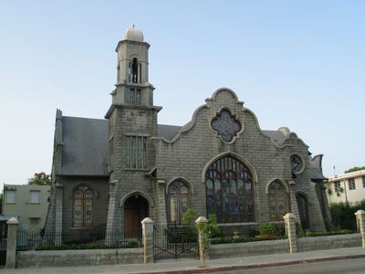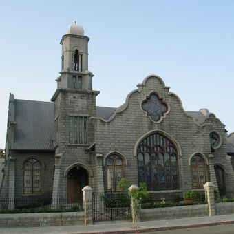 El edificio incorpora elementos neogóticos, coloniales españoles, barrocos españoles y bizantinos con construcción de hormigón rústico y techos de madera.