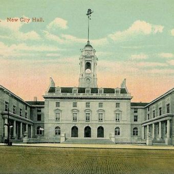 El edificio de granito en Congress Street presenta una estructura central de tres pisos con una torre de 60 metros y columnas toscanas.