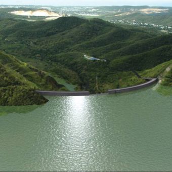 La Represa Portugués se eleva 220 pies de altura con una longitud de cresta de 1,230 pies, utilizando concreto compactado con rodillo.