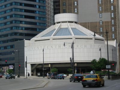 La Seventeenth Church of Christ, Scientist es un templo brutalista en el Loop con un santuario semicircular de dos plantas que acomoda unos 764 lugares en su forma de hormigón circular. La estructura presenta muros de hormigón macizo y formas geométricas que definen su carácter arquitectónico moderno.