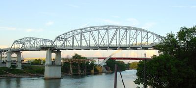 Este puente de armadura se extiende 960 metros sobre el río Cumberland, conectando el centro de Nashville con el distrito este mediante carriles peatonales.
