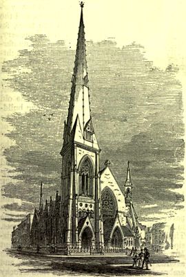 La estructura de piedra arenisca de estilo gótico ocupaba la esquina noroeste de la Quinta Avenida y la calle 48, con una alta aguja cónica.