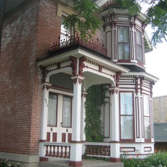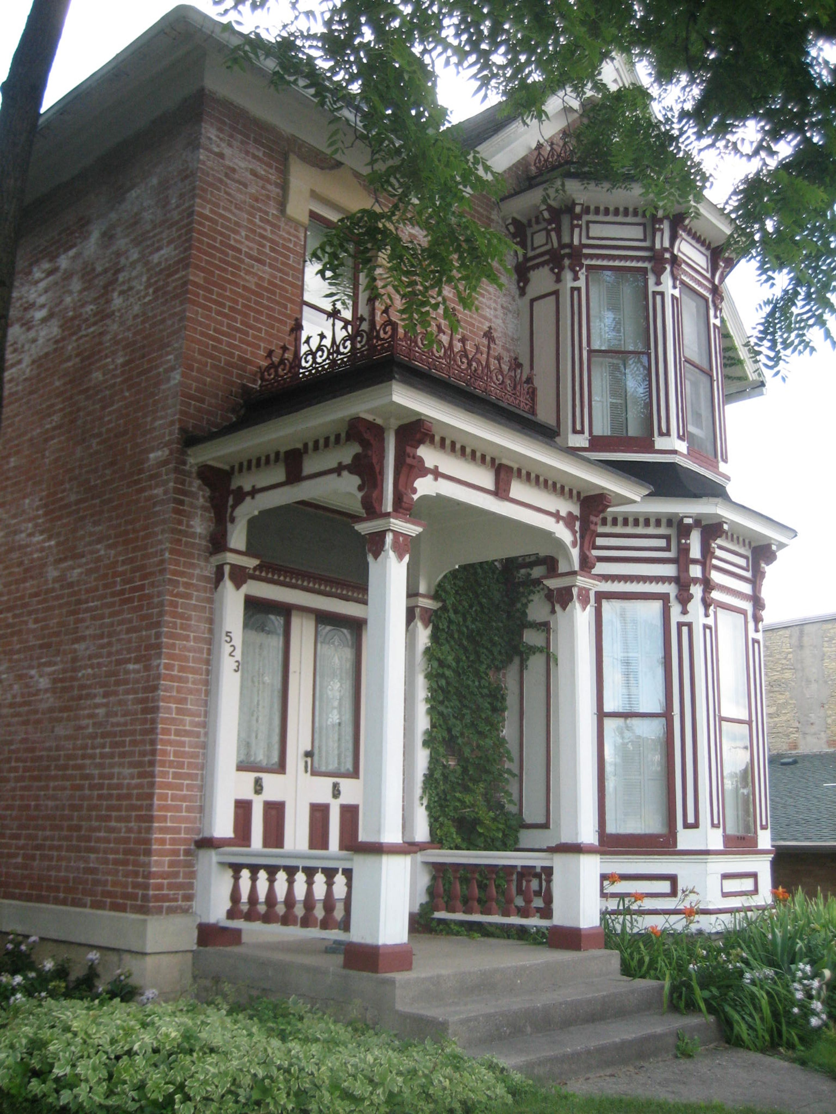 La Casa William H. Roberts exhibe paredes de ladrillo prensado de Indiana, adornos de piedra Joliet, ventanas saledizas y una entrada con porche decorado.