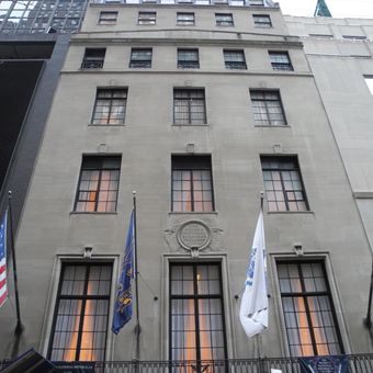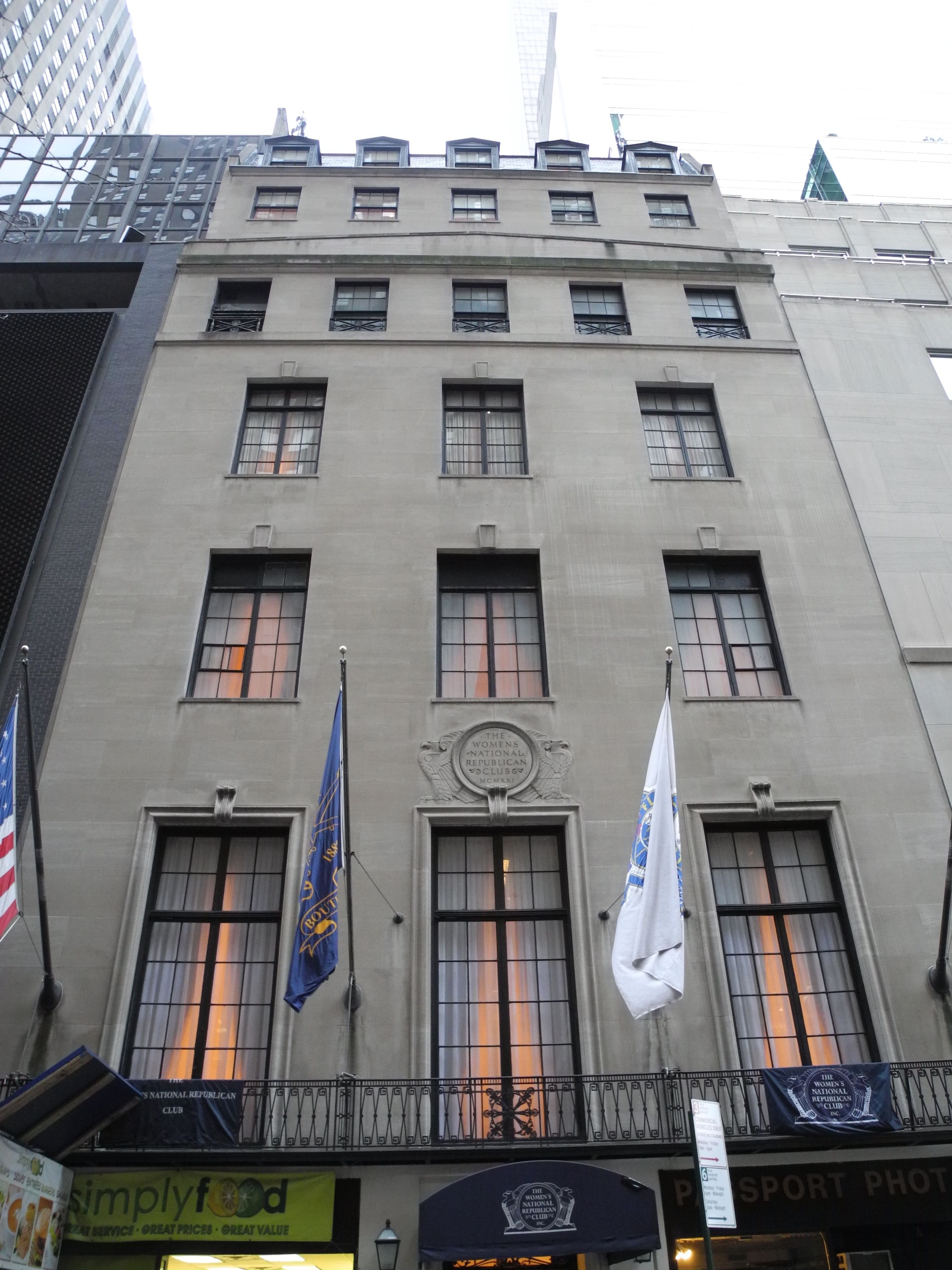 El Club Nacional Republicano de Mujeres ocupa un edificio neogorgiano en 3 West 51st Street, con detalles arquitectónicos en ladrillo y piedra caliza.
