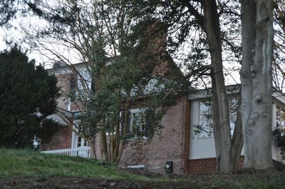 La estructura de ladrillo presenta una fachada tripartita con un bloque central de dos pisos y alas laterales de un solo nivel.