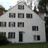 El edificio de piedra de tres pisos y medio presenta un techo a dos aguas pronunciado, paredes exteriores estucadas y una adición de madera de un piso.